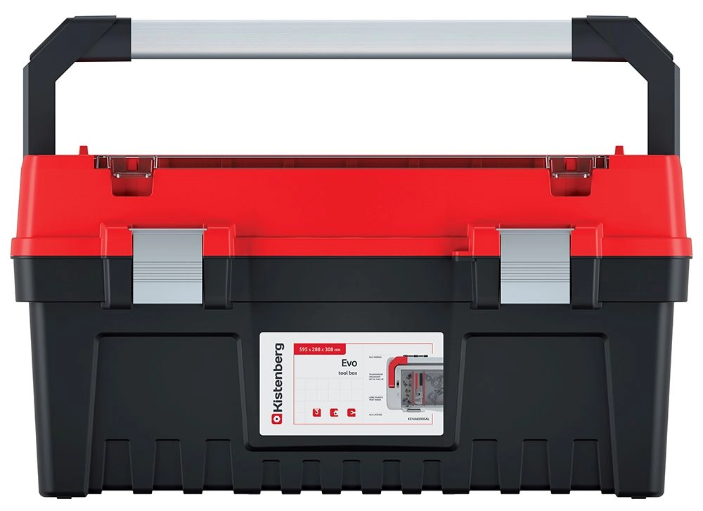 Den praktiske EVO-værktøjskasse tilbyder robust konstruktion, metallåse og metalhåndtag til sikker transport. Takket være den aftagelige indsatsorganizer og udvendigt rum med lås og justerbare skillevægge holder den skruer, bits og småt tilbehør pænt organiseret på deres plads.