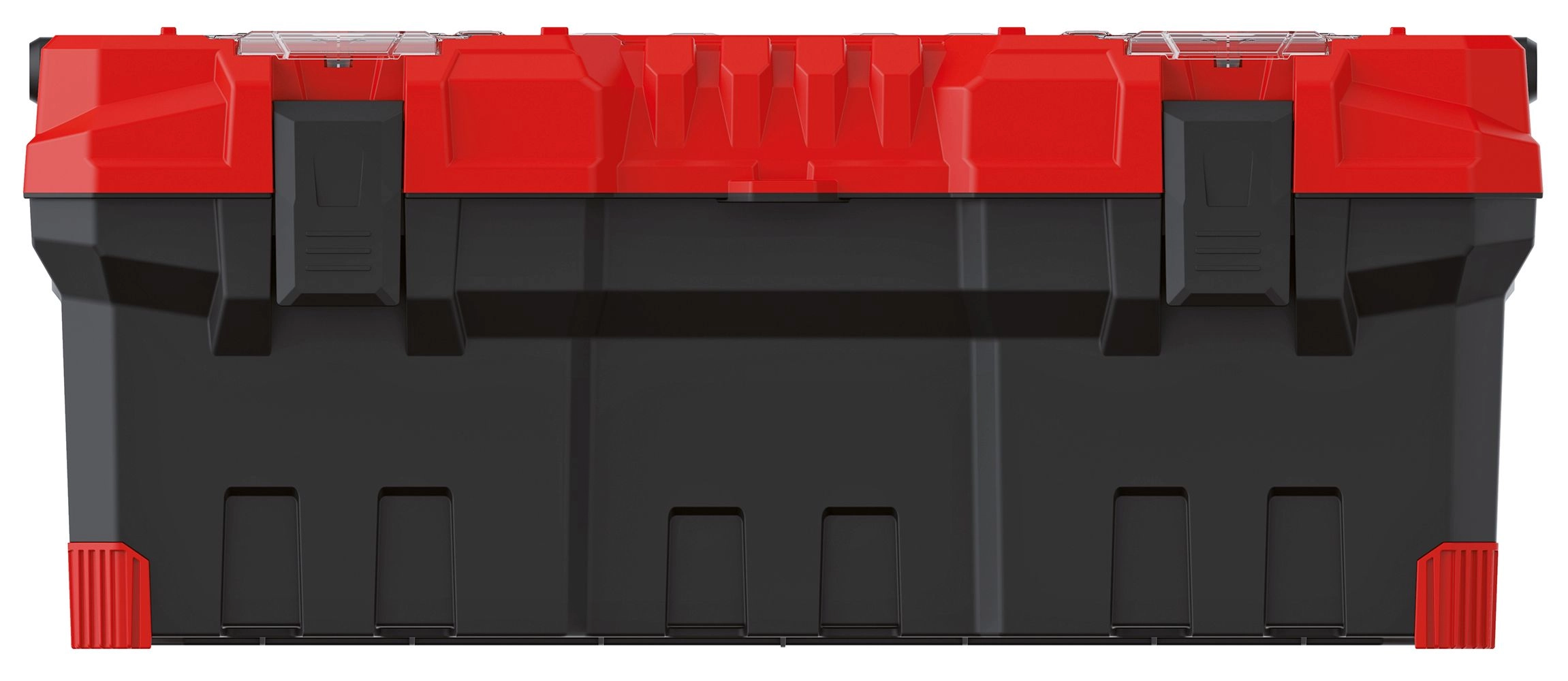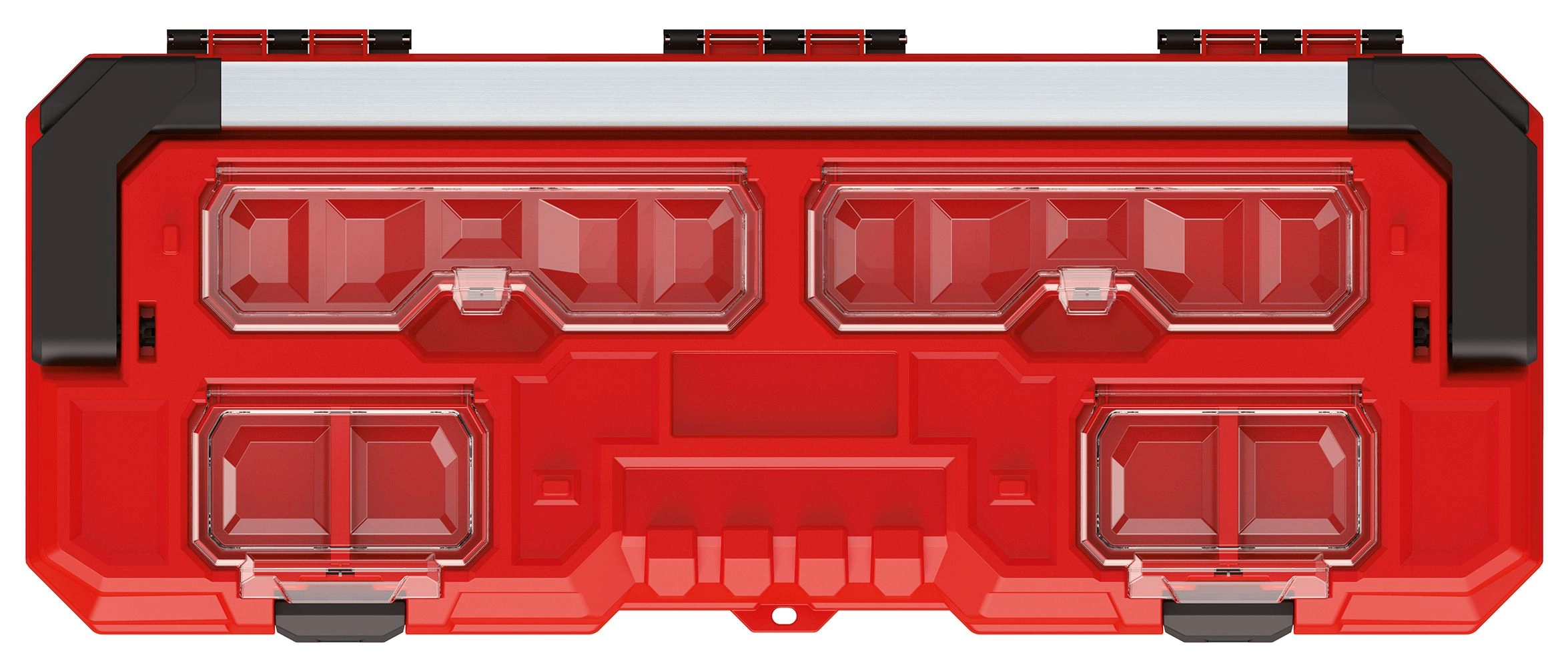 TITAN PLUS værktøjskassen i rød udgave kombinerer høj holdbarhed og smart organisering. Det øverste låg med gennemsigtige rum giver øjeblikkeligt overblik over skruer, rawlplugs og bits, mens det rummelige hovedrum rummer håndværktøj og mindre elværktøj. Metalhåndtaget sikrer fast greb og behagelig transport selv ved højere belastning.