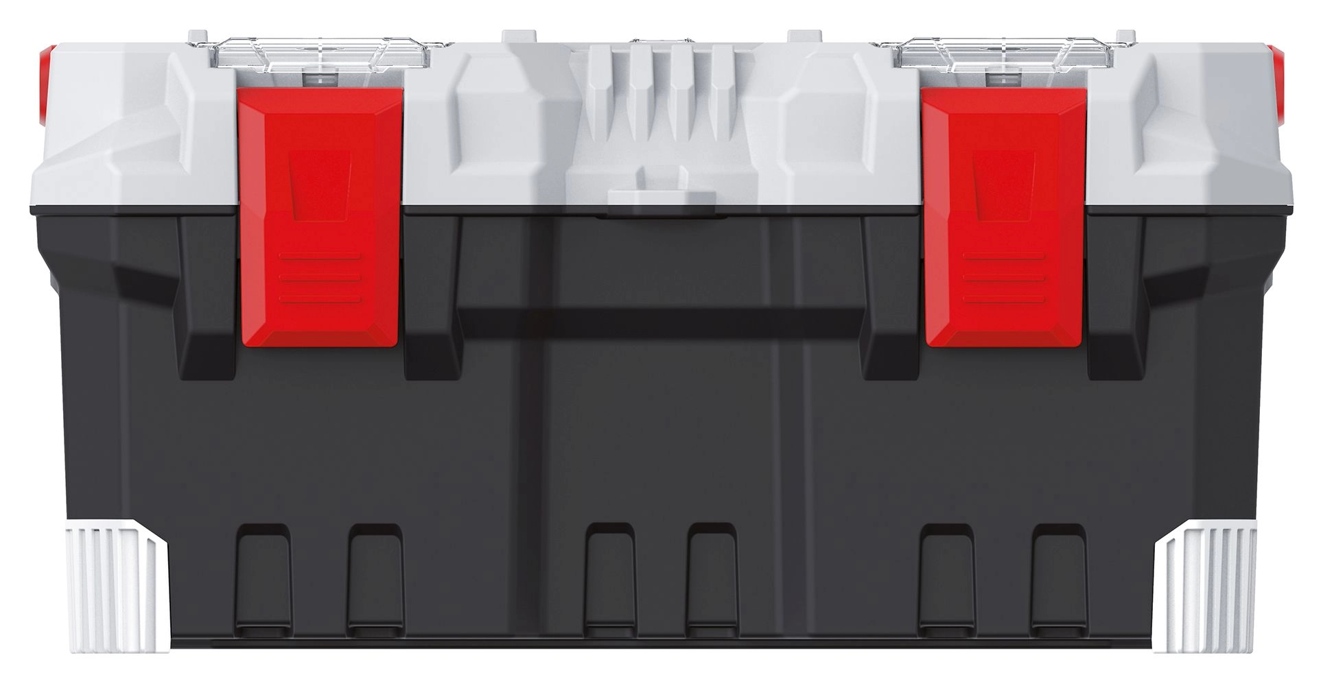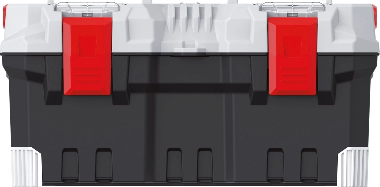 Robust plastbund med forstærkede hjørner og pålidelige spænder beskytter indholdet under arbejde og transport.