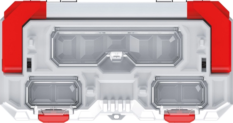 Låg med transparente organisatorer holder skruer, rawlplugs og bits adskilt og hurtigt tilgængelige – uden at åbne hele kassen.
