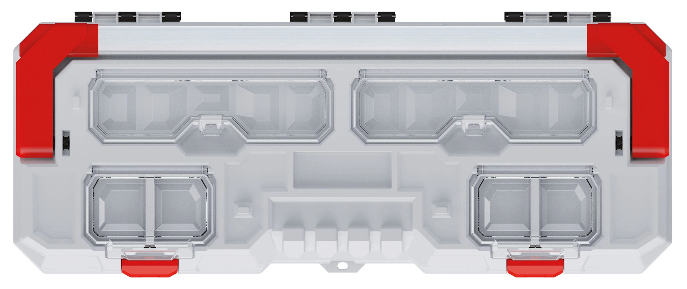 De øverste gennemsigtige rum gør det let at have skruer, rawlplugs og bits synlige og lige ved hånden. Snap-lukninger holder indholdet sikkert på plads, også under transport.
