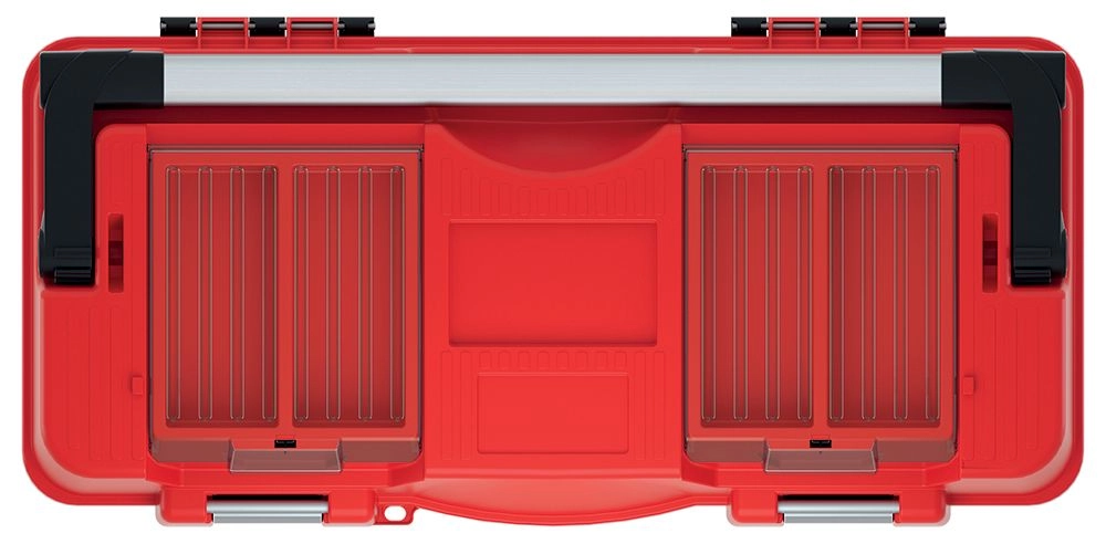 Den smarte indretning omfatter en aftagelig indvendig indsats og to gennemsigtige organisere i låget med polycarbonatdæksler, som beskytter skruer og bits og giver hurtigt overblik. Det brede anodiserede aluminiumsbærehåndtag sikrer behagelig transport, mens et par solide aluminiumslåse holder indholdet sikkert lukket.