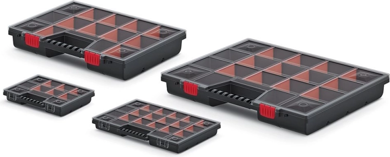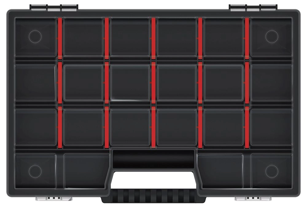 Det indvendige rum består af 15 udtagelige rum, som kan omarrangeres frit og tilpasses størrelsen på de opbevarede genstande. Organisatoren er ideel til hjemmet, værkstedet og fiskegrej – den fylder minimalt og giver maksimal oversigt.