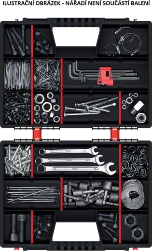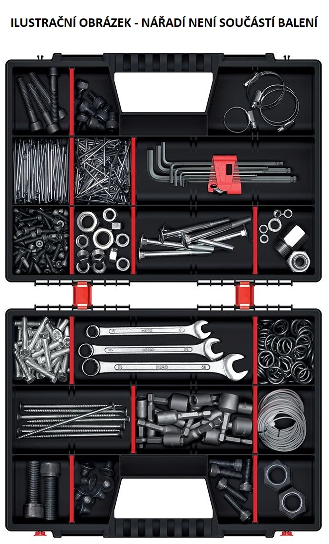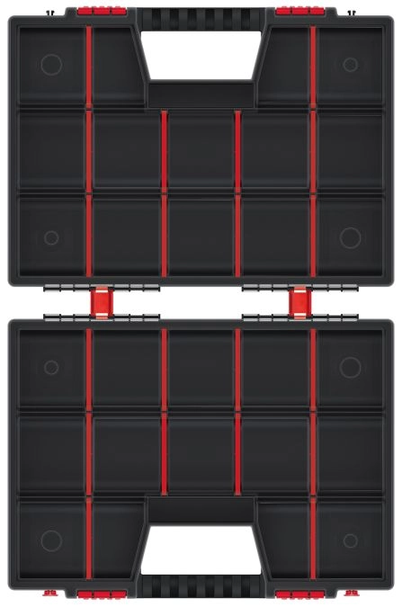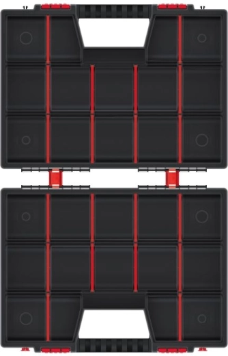 Den praktiske plastorganisator NOR DUO tilbyder to indbyrdes forbundne bokse, som kan nemt adskilles og bruges hver for sig. Takket være aftagelige skillevægge kan du justere antal og størrelse på rummene op til 28, det gennemsigtige låg muliggør hurtig kontrol af indholdet, og det ergonomiske håndtag sikrer behagelig transport. Dobbelte låse og mod hinanden vendte låg beskytter sikkert små dele, værktøj og fiskegrej.