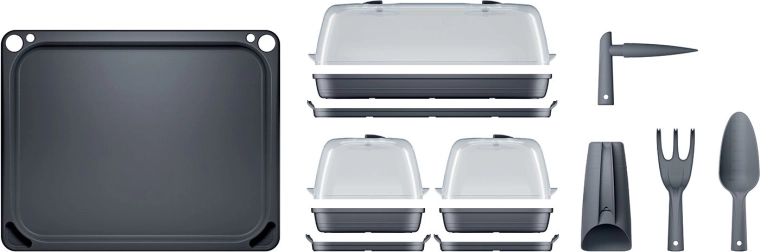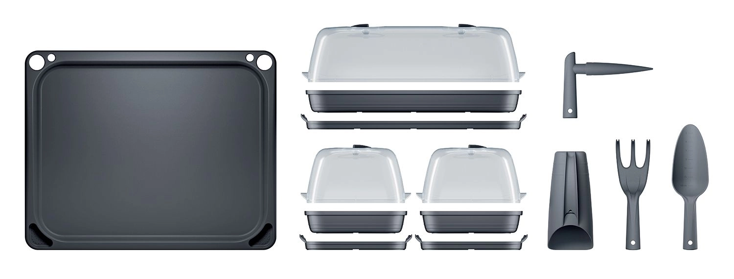 I sættet finder du tre minidrivhuse, en bakke og fire stykker værktøj (plantesyl, skovl, rive, skål til jord) – alt i matchende antracitfarve. Sættet er ideelt til frøspiring, formering af stiklinger og dyrkning af små urter på vindueskarmen eller køkkenbordet.