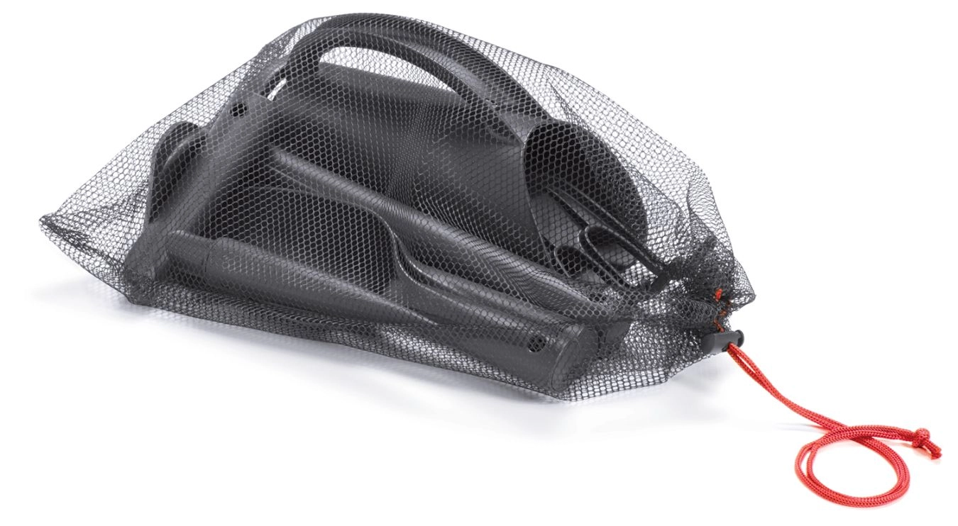 Sættet er opbevaret i en let net-snørepose, der holder værktøjet samlet, lader sand og vand løbe fra og gør det nemt at bære og opbevare.