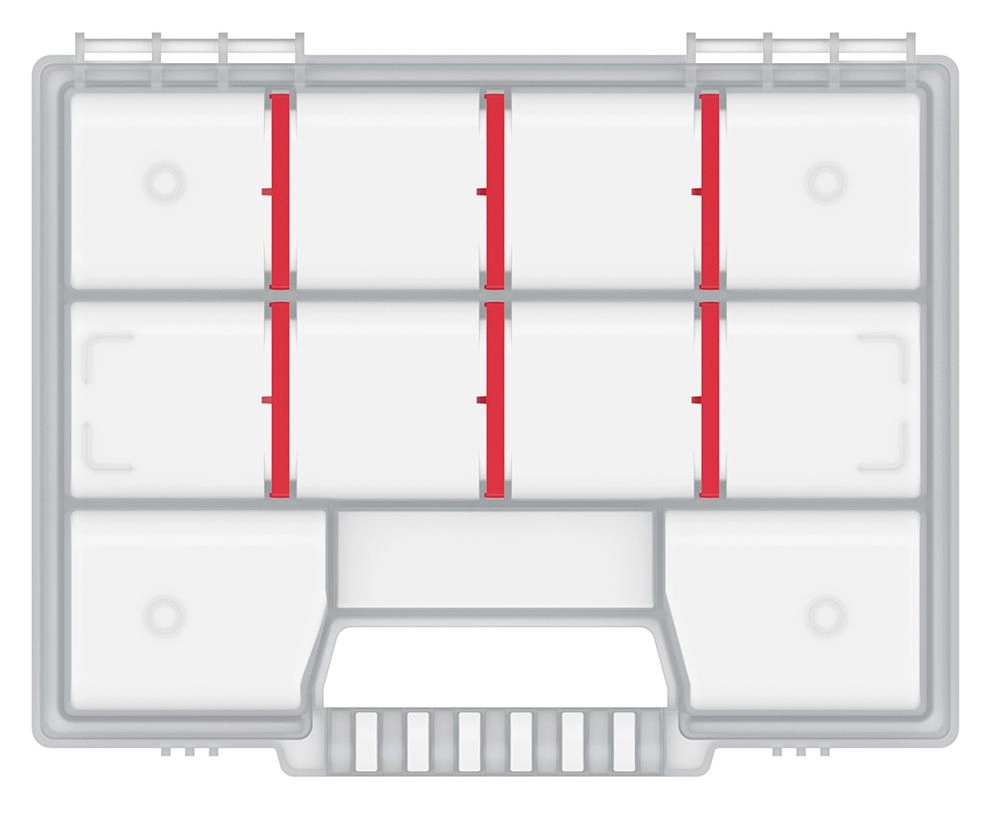 Hold styr på små befæstelseselementer og komponenter med NORT-organisatoren. Det gennemsigtige låg giver et hurtigt visuelt overblik, så du straks ved, hvor alting ligger. Med de aftagelige skillevægge tilpasser du nemt det indre rum præcist efter aktuelle behov.