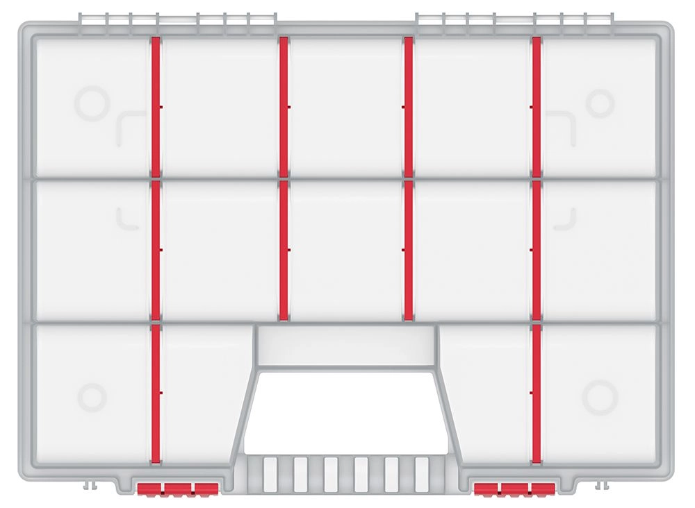 Fleksibel indretning sikres af aftagelige skillevægge – du tilpasser nemt størrelse og antal rum efter aktuelle behov. Det ergonomiske håndtag gør transporten lettere, og de solide klips holder låget sikkert lukket selv under transport.