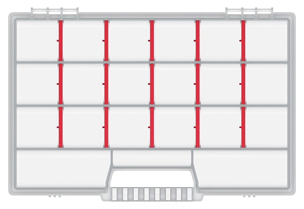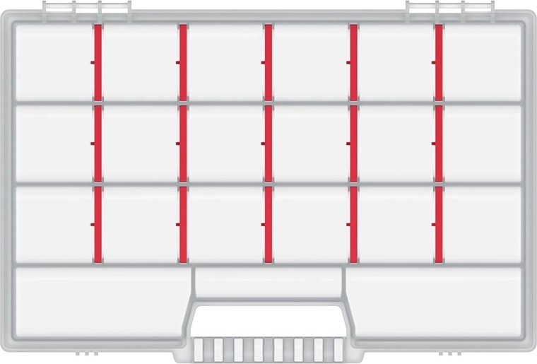 Den praktiske plastorganizer NORT med 22 rum holder dine skruer, møtrikker, skiver og pakninger overskueligt samlet ét sted. Takket være transparent plast finder du altid hurtigt det, du har brug for, og aftagelige skillevægge gør det nemt at tilpasse rummenes størrelse. De kompakte mål og det stærke håndtag gør den til en fremragende hjælper i værkstedet, garagen og til hobbyprojekter.