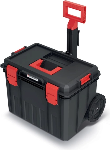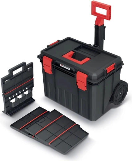 Værktøjskassen med målene 530 × 355 × 390 mm er designet til daglig brug på byggepladsen, i værkstedet og i garagen. Store hjul, teleskophåndtag og et solidt øvre bærehåndtag sikrer bekvem og sikker manøvrering, mens den robuste plast tåler stød og barske forhold.