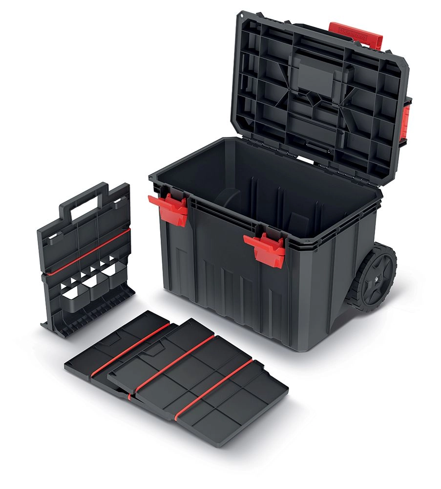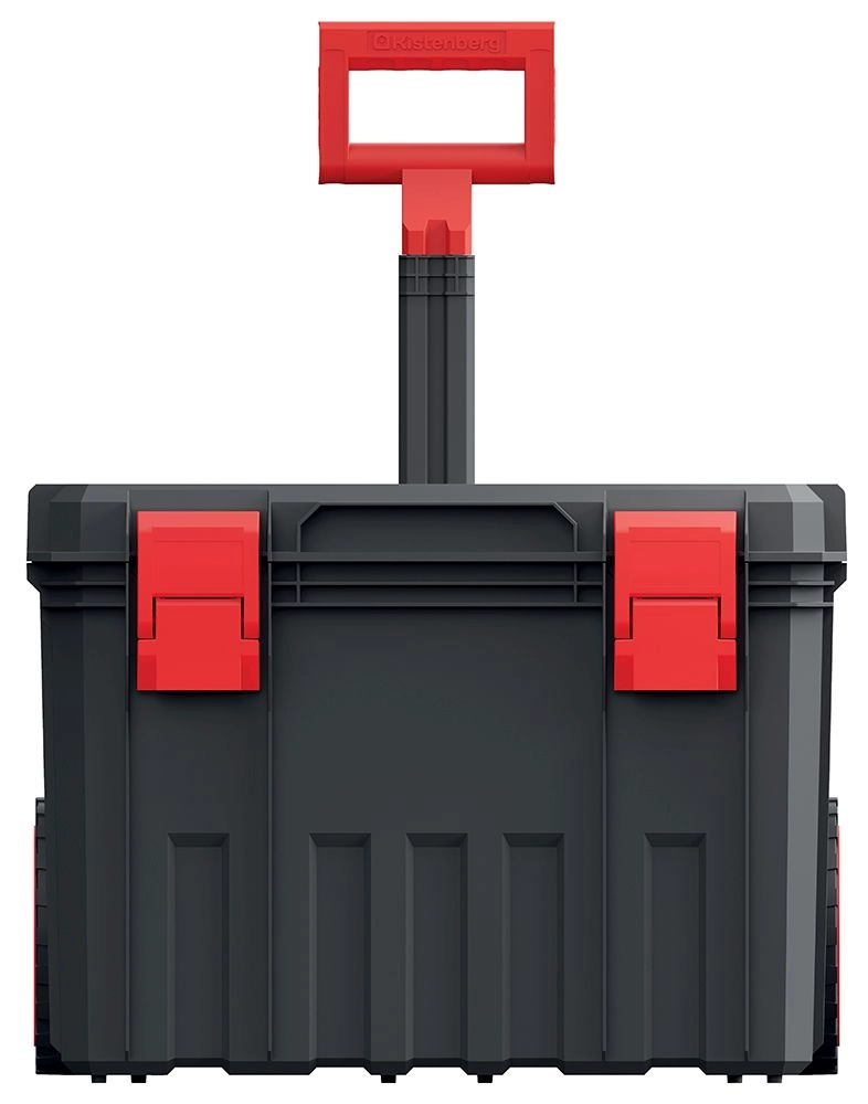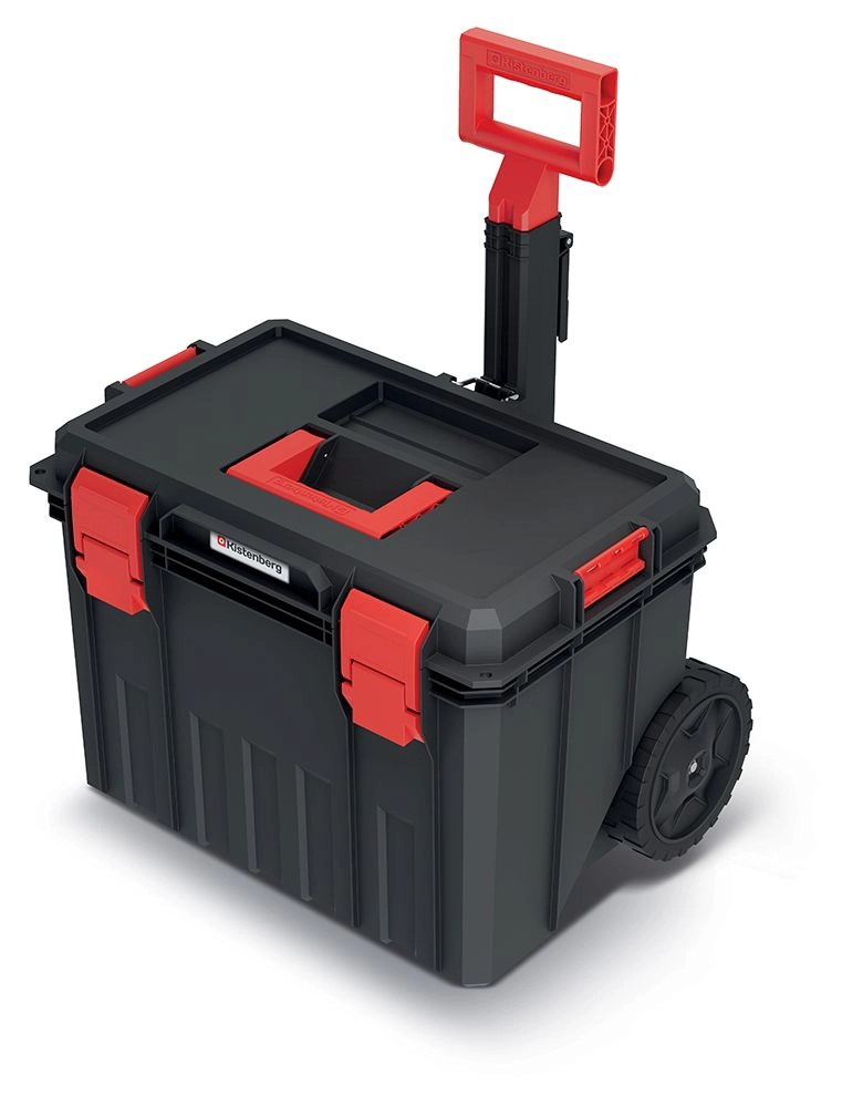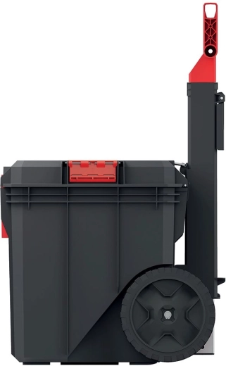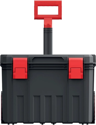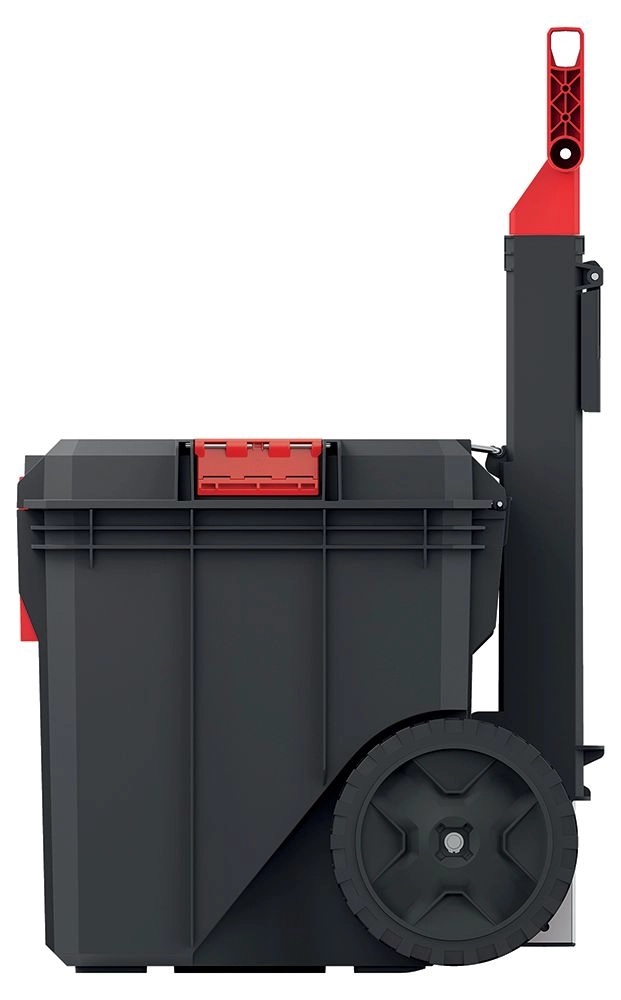 Store, slidstærke hjul og et udtrækkeligt håndtag gør det nemt og bekvemt at flytte selv en fuldt læsset kasse i værkstedet, på byggepladsen eller over ujævnt underlag.
