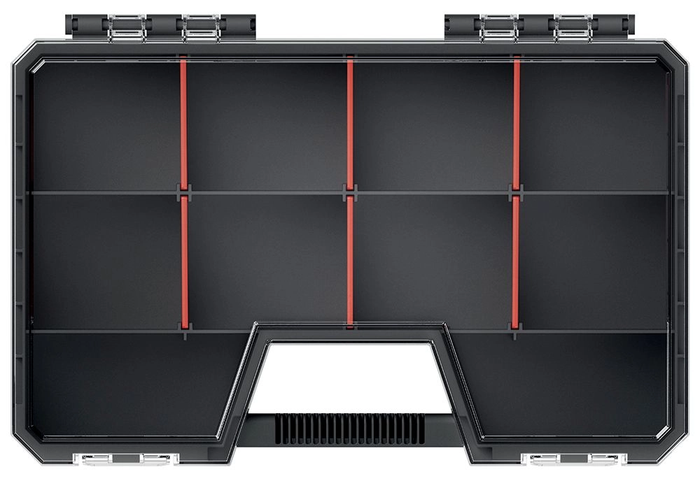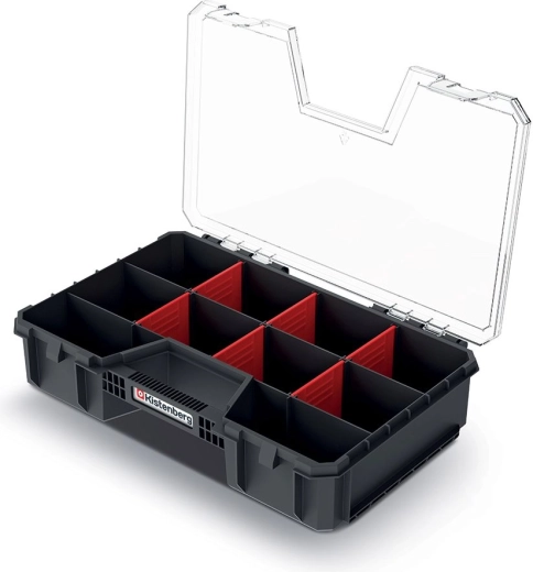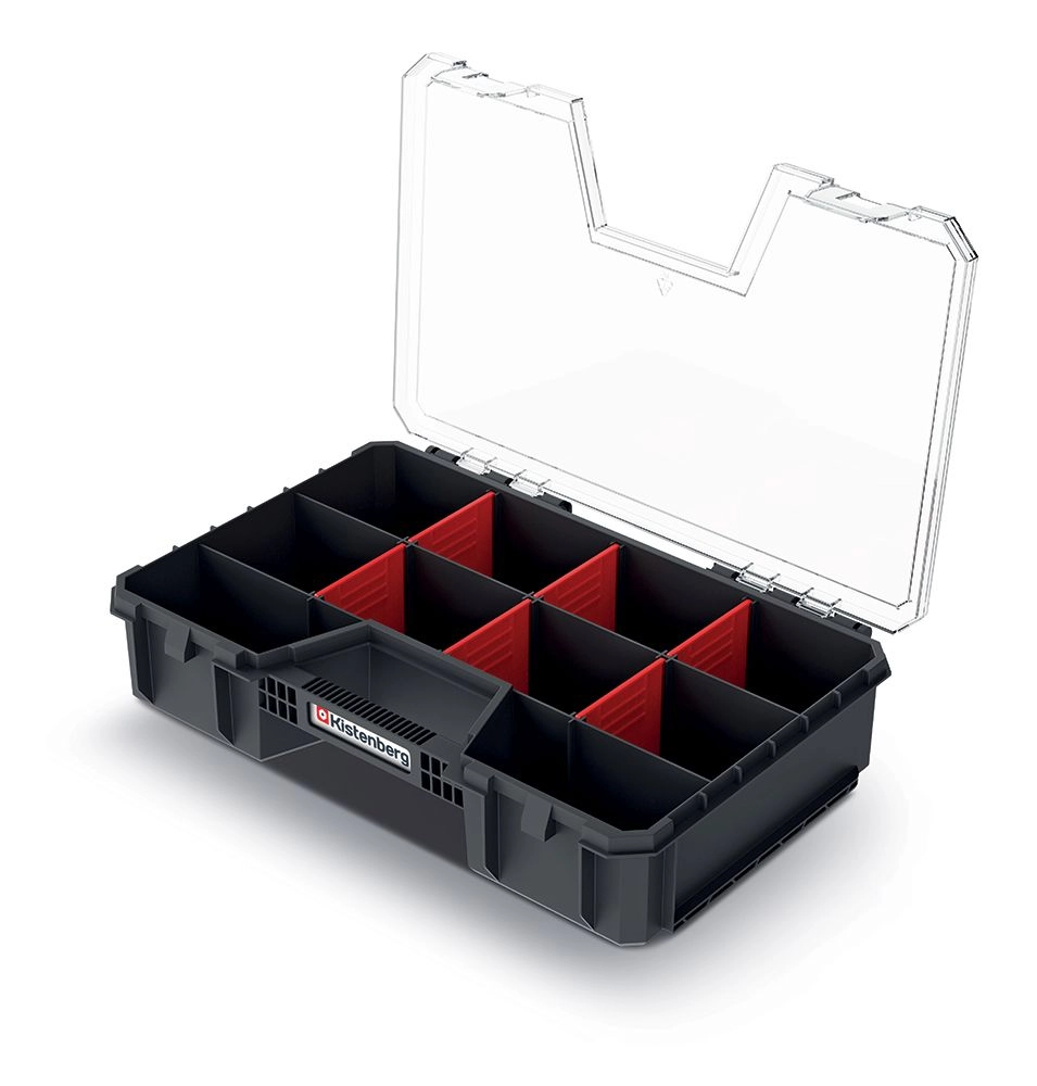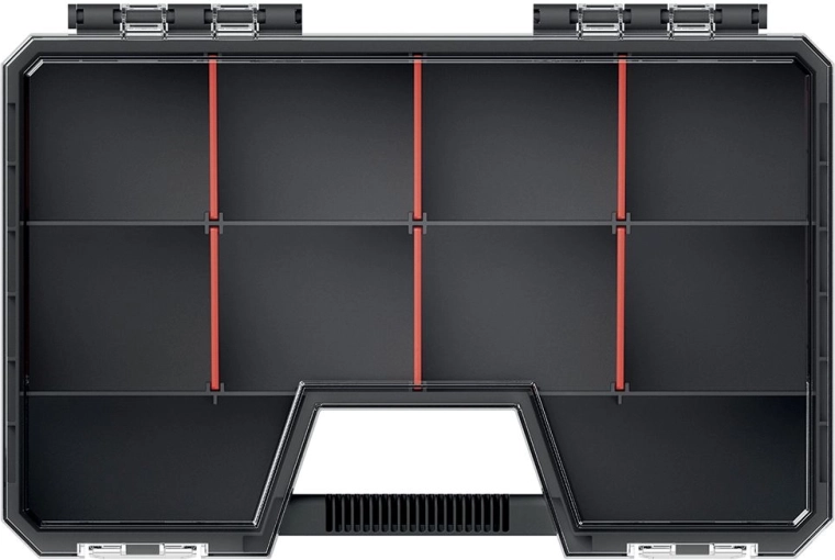 Takket være de aftagelige røde skillevægge kan du nemt tilpasse den indvendige inddeling præcist efter aktuelle behov – fra skruer og rawlplugs over elektroniske komponenter til LEGO-dele. Den lette og holdbare konstruktion i kvalitetsplast sikrer lang levetid og nem transport.