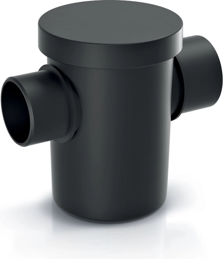 Filteret består af tre nøgledele: et hus med sidestudse til rørtilslutning, en udtagelig kurv til opsamling af urenheder samt et topdæksel, der giver nem adgang ved vedligeholdelse. Den robuste plastkonstruktion sikrer lang levetid og sikker drift selv under skiftende forhold.