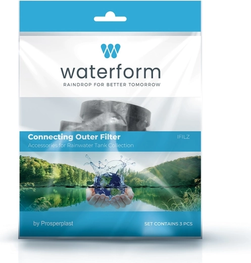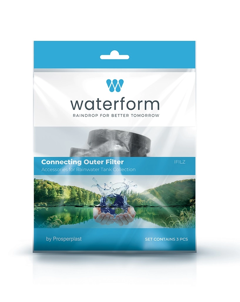 Det tredelte sæt i retail-emballage er klar til hurtig tilslutning til regnvandsopsamlingssystemer ved WATERFORM- og ARVES-tønder.