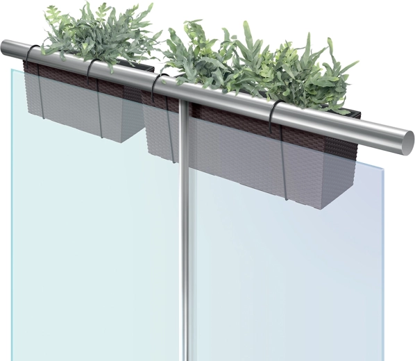 To metalkroge sikrer hurtig og stabil montering på de fleste altangelændere uden brug af værktøj.