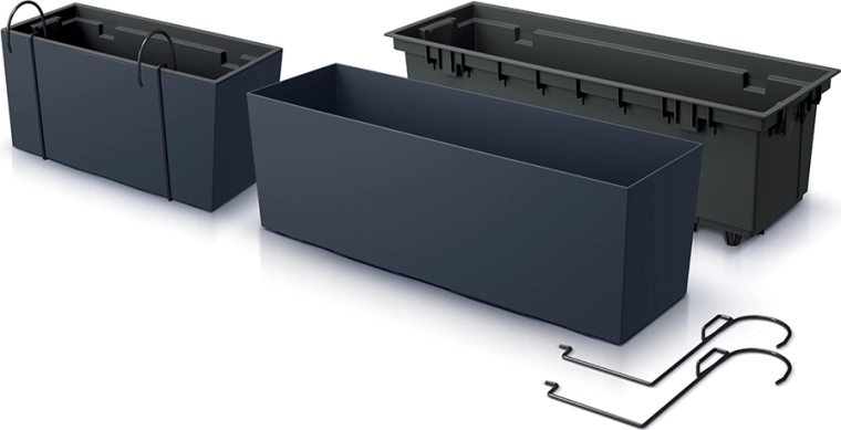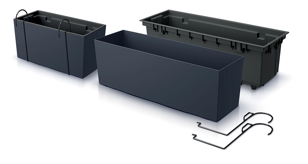 Pakken indeholder en aftagelig indsats for bekvem plantning og vanding samt stærke metalkroge til sikker ophængning på gelænder eller anden konstruktion. Takket være den lave vægt kan kassen nemt flyttes efter behov og lysforhold.