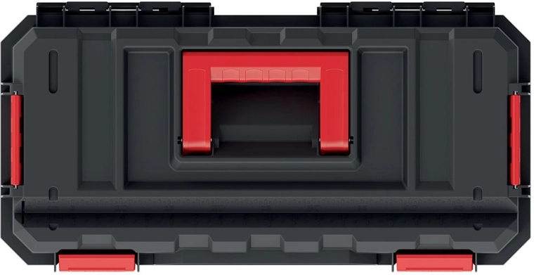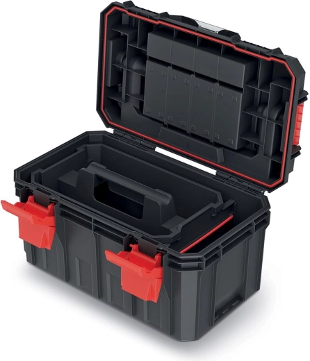 Den smarte indretning med en udtagelig indsats og rum i låget gør det let at sortere småtilbehør og holde værktøjet lige ved hånden. Det ergonomiske, nedfældbare håndtag giver et behageligt greb og sikker bæring. Den sorte finish med røde detaljer ser professionel ud og passer ind i ethvert arbejdsmiljø.