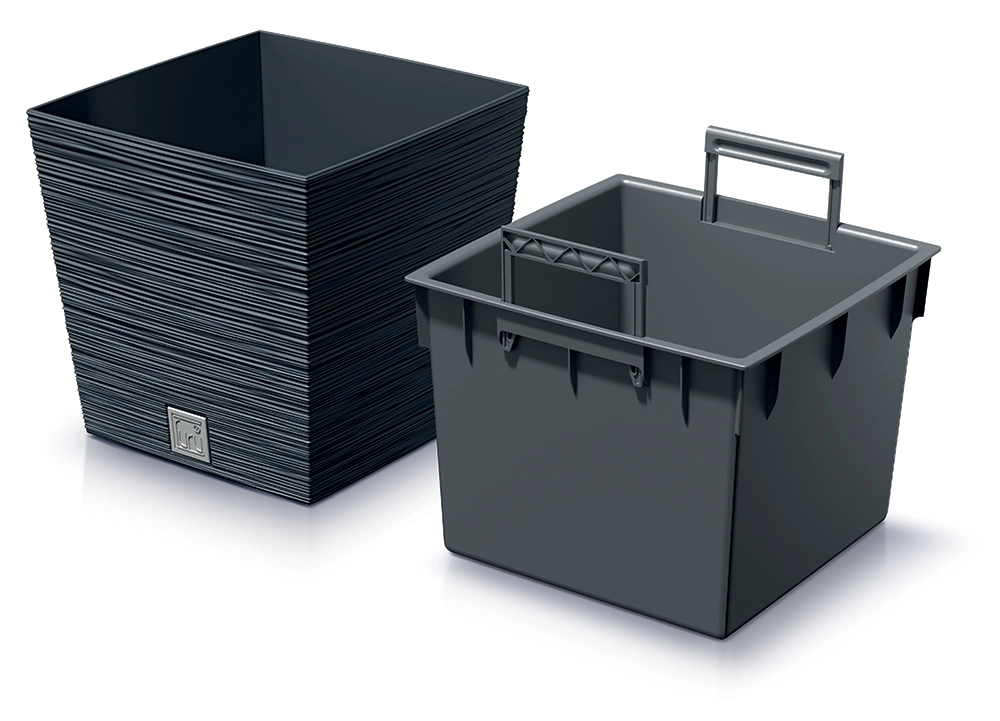 Furu Square Low blomsterkrukke 24 cm i antracit kombinerer tidløst udseende og praktisk udførelse. Den riflede tekstur giver et moderne præg, mens den slidstærke plast sikrer lav vægt og lang levetid både inde og ude. Den indvendige indsats med håndtag gør omplantning og flytning af planter nemt og uden rod.