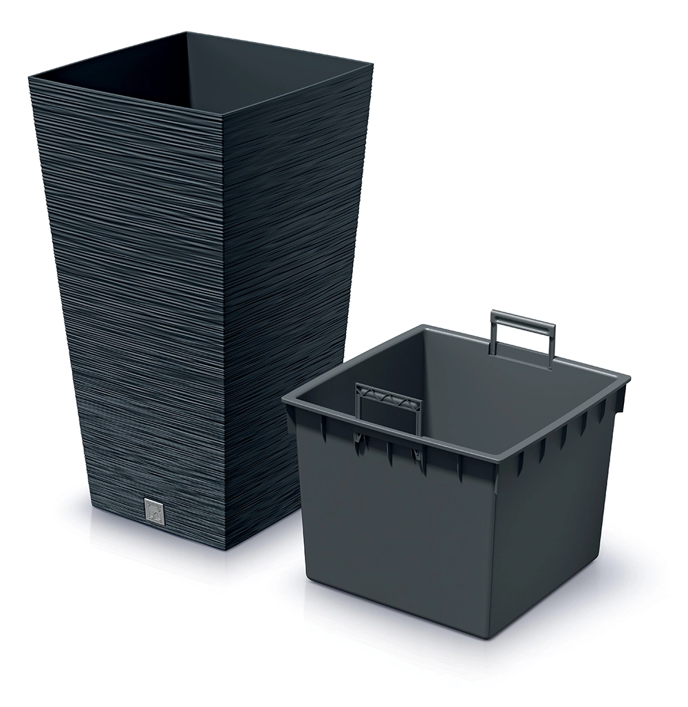 Furu Square-blomsterkrukken i antracit giver dine planter en elegant ramme og dit rum et moderne udtryk. Den rillede tekstur og tilspidsede form sparer plads, mens den kvalitetsrige plast klarer regn, sol og frost. Velegnet til altan, terrasse og dagligstue.
