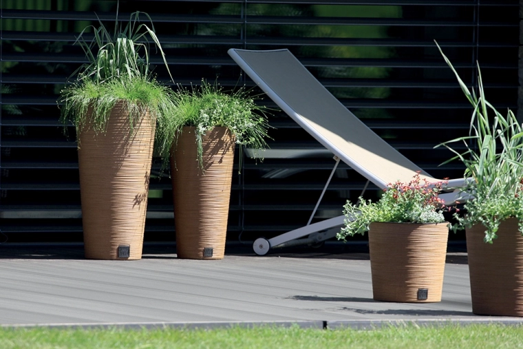 Den riflede overflade med træeffekt i farven naturo giver potten et naturligt udseende og passer nemt ind i både indendørs og udendørs miljøer.