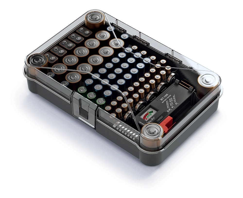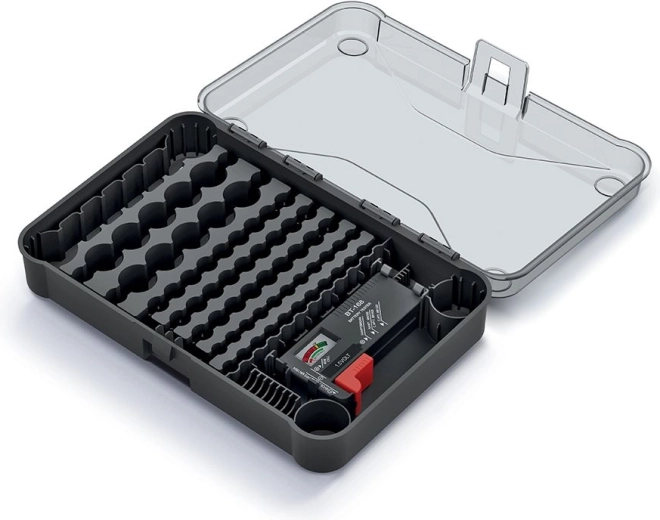 Den praktiske batteriboks med gennemsigtigt låg giver et klart overblik over AA-, AAA-, C-, D- og 9V-batterier, som placeres i dedikerede rum. Den integrerede analoge tester gør det muligt på et øjeblik at kontrollere den resterende kapacitet, så du altid ved, hvilke batterier der er klar til brug.