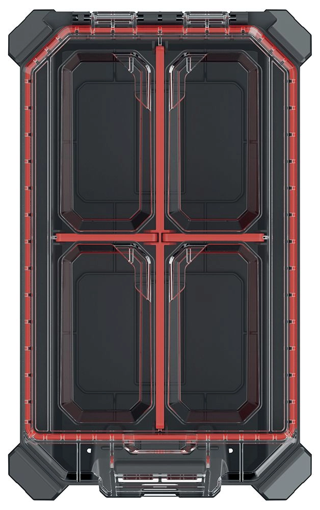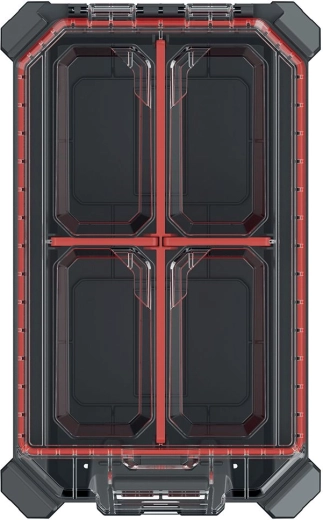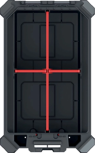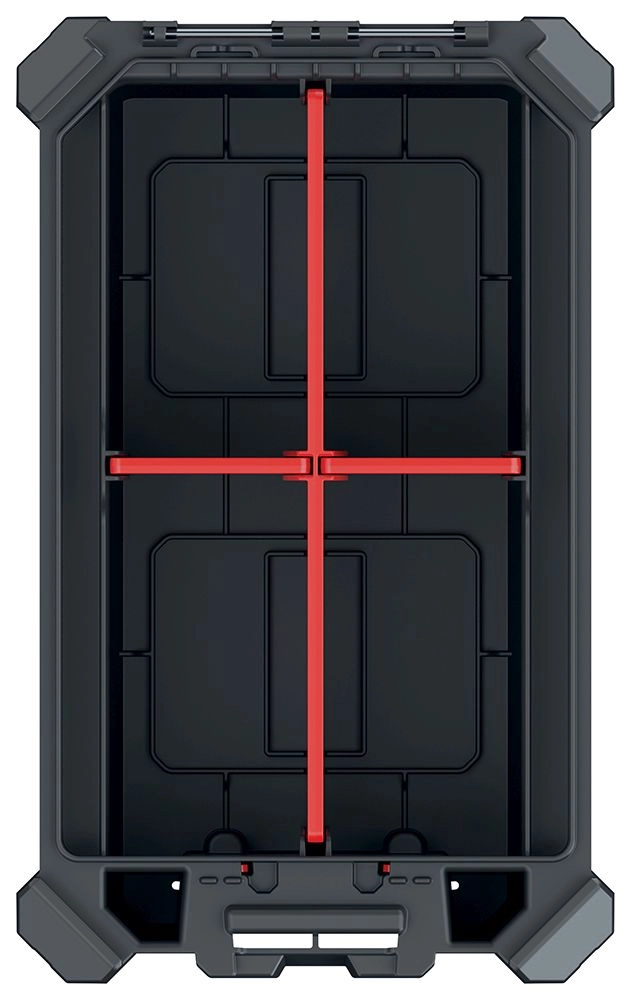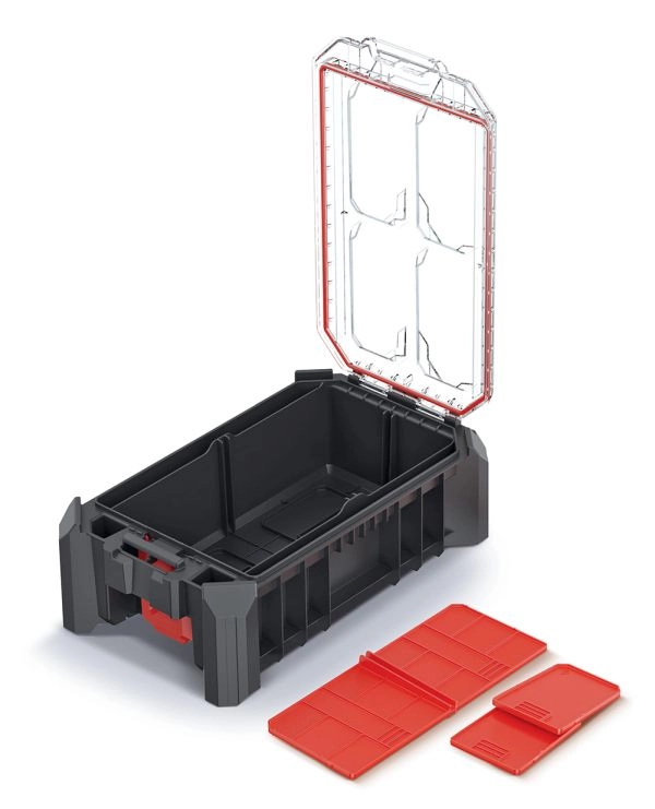 Det indvendige rum tilpasses nemt med 3 aftagelige skillevægge. Metalhængsler øger holdbarheden, og den sikre lukning suppleres af MSX låse-/stablesystem, som gør det muligt at sammenkoble flere organisere og spare plads ved opbevaring og transport.