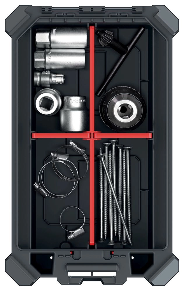 Tre aftagelige skillevægge lader dig tilpasse rummene præcist efter størrelsen på skruer, bits eller småt værktøj.