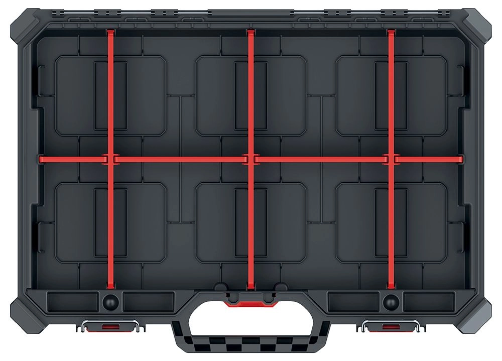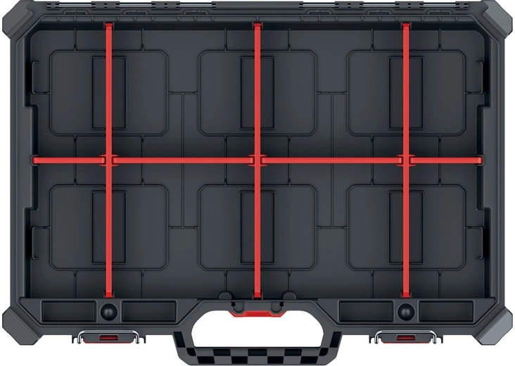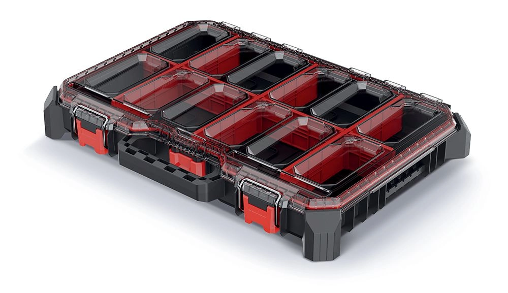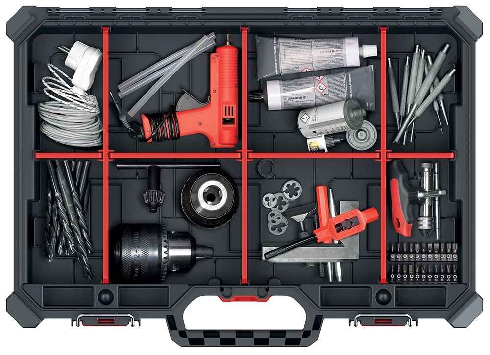 Takket være den lave profil og det solide håndtag er organiseren let at bære og stable på hylder eller i bilen. Metalthængsler, ABS-låse og en tætningsliste rundt om kanten beskytter skruer, rawlplugs og bits mod støv og fugt.