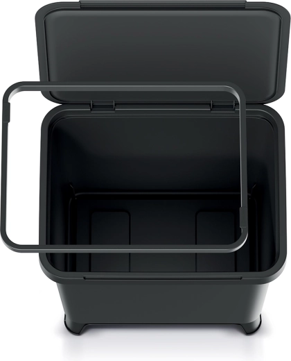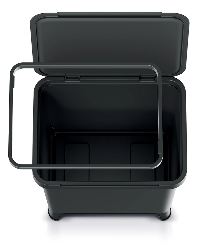 Stilfuld og praktisk affaldsspand med volumen på 29 l af genanvendt plast i elegant sort. De kompakte mål sparer plads, det roterende låg forhindrer effektivt lugt, og den faste kant holder posen sikkert på plads. En del af den modulære Systema-serie, belønnet med Red Dot Design Award 2023 – ideel til affaldssortering derhjemme og på kontoret.