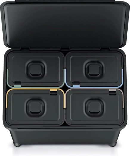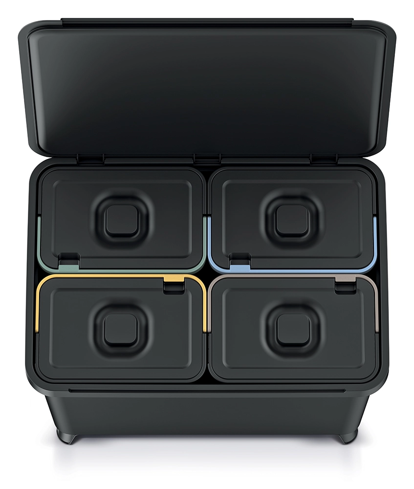 Hver af de fire indsatsbeholdere på 10 l har en farvet kant for hurtig identifikation af affaldet. De udtagelige beholdere med bære-håndtag gør tømning og vedligeholdelse nemmere.