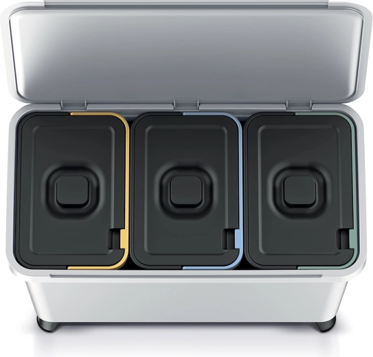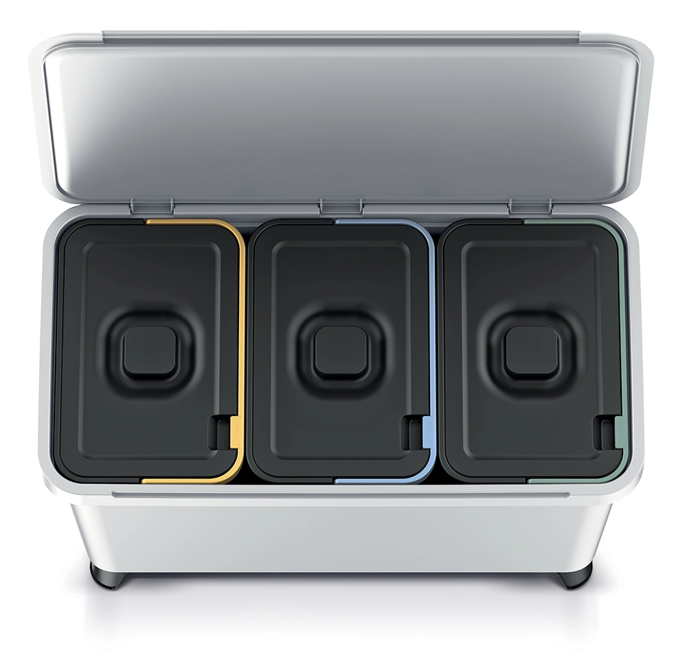 Tre udtagelige inderbeholdere á 10 l med farvemarkerede låg fremskynder sorteringen og holder orden ét sted.