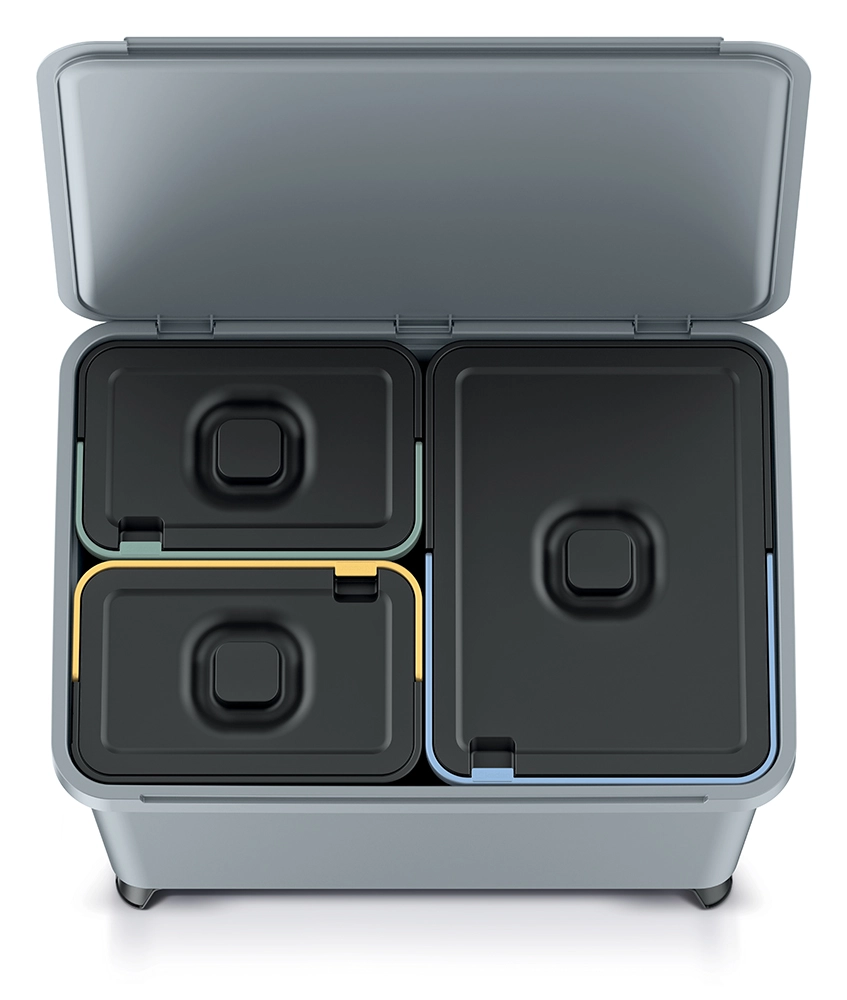 Hovedlåget med indvendige indsatser sikrer hurtig åbning og gør det let at tømme og rengøre de enkelte beholdere.