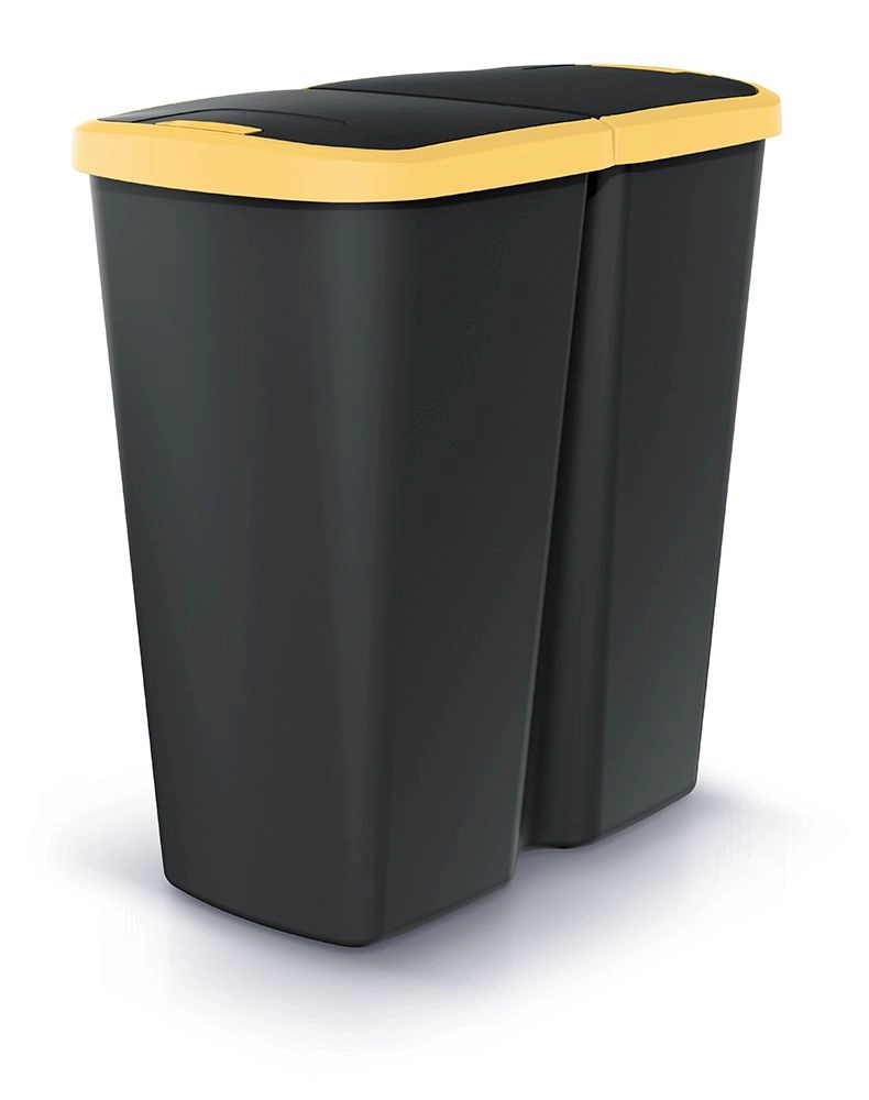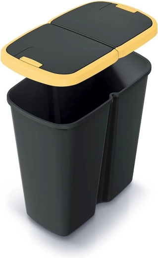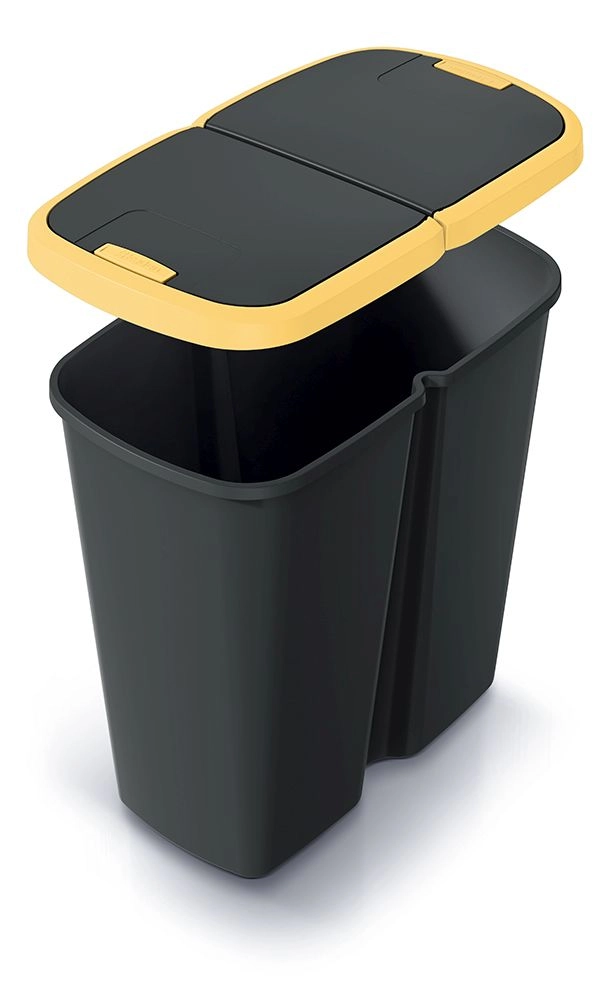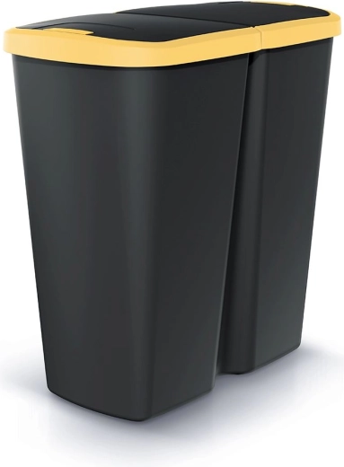 Praktisk affaldsspand med en kapacitet på 45 l og dobbelt låg, som tilbyder nem affaldssortering i hjemmet og på kontoret. Med knapåbning er håndteringen bekvem og hygiejnisk, mens slagfast plast og kompakte mål sikrer lang levetid og pladsbesparelse. Det kontrasterende gule låg gør visuel sortering lettere.