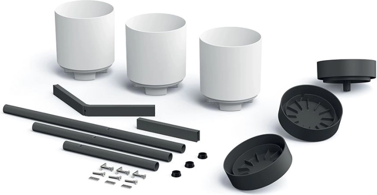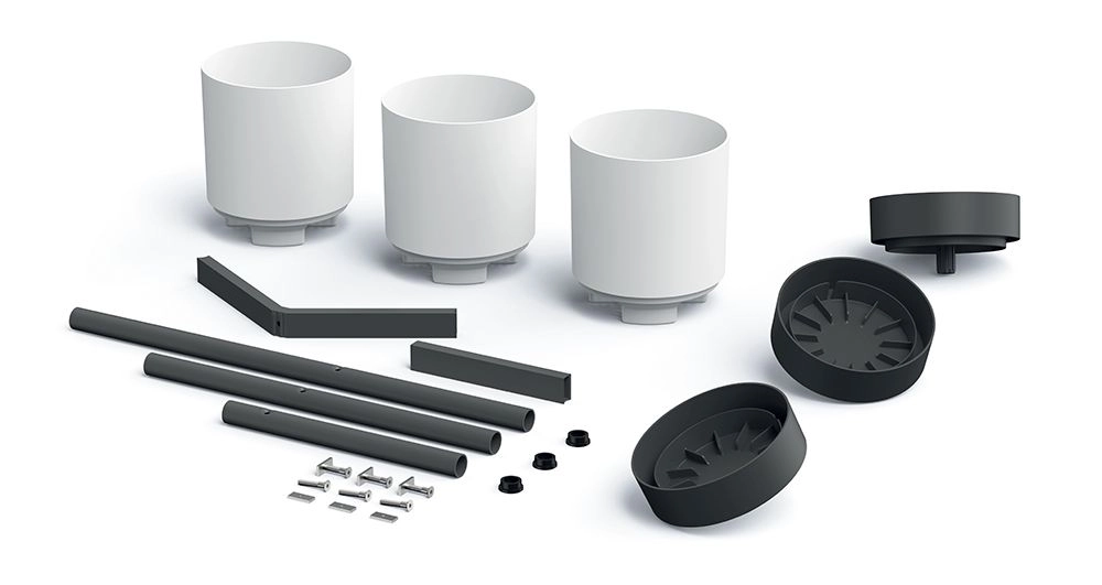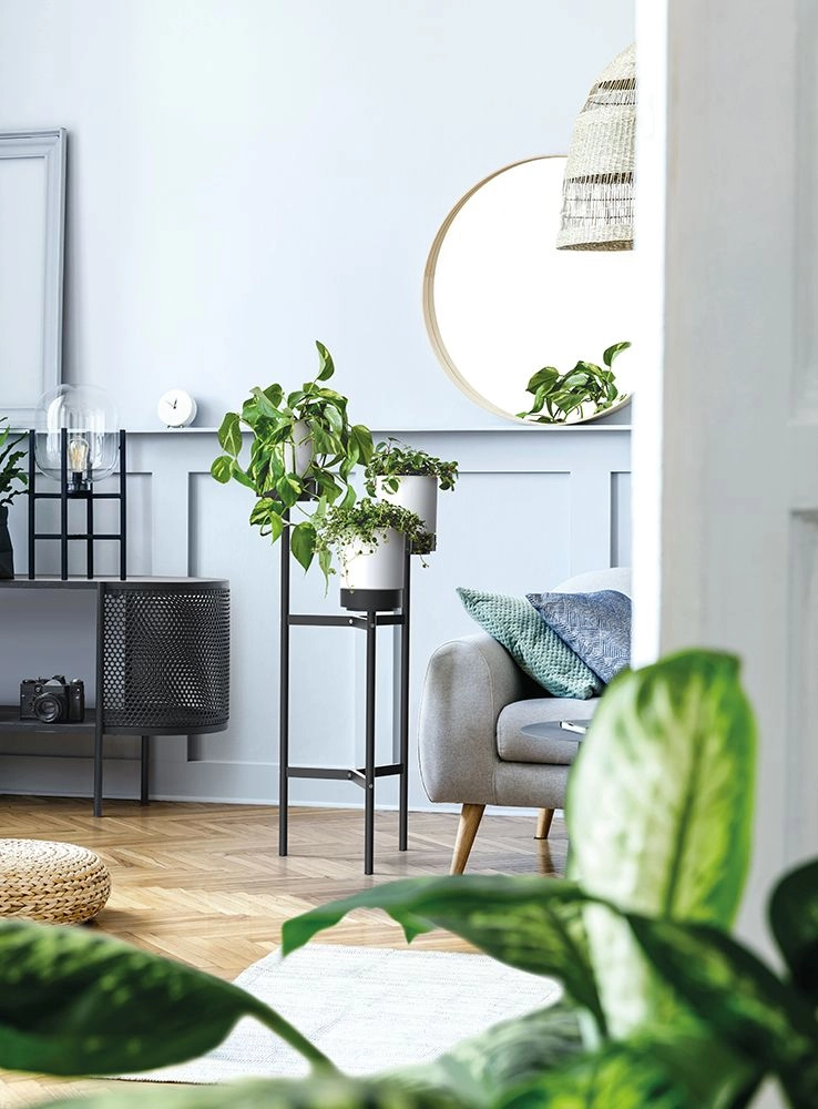 Design-plantestativet Bloomie Stand kombinerer en moderne metalramme med holdbare plastplantekrukker. Placeringen i forskellige niveauer fremhæver silhuetten af hver plante, forbedrer lysadgangen og skaber en imponerende grøn komposition i ethvert interiør.