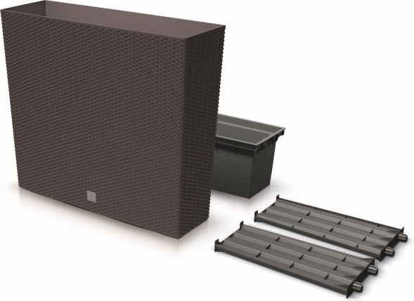 Elegant høj altankasse med indsats Rato Case i længden 58 cm i antracit, ideel til både indendørs og udendørs brug. Den kombinerer en naturtro imitation af rattan-flet med en holdbar plastkonstruktion, som tåler UV-stråling, vejrpåvirkninger og frost. Inkluderer en sort indsats for nem plantning, som gør vedligeholdelsen lettere og fremmer sund plantevækst.
