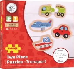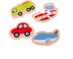 Denne træpuslespilssæt indeholder fire populære transportmidler, som børn nemt samler af to robuste brikker. Enkle former, kraftige farver og den behagelige træfinish indbyder til gentagen leg og understøtter naturligt udviklingen af sprog, genkendelse af former og farver samt koncentration.