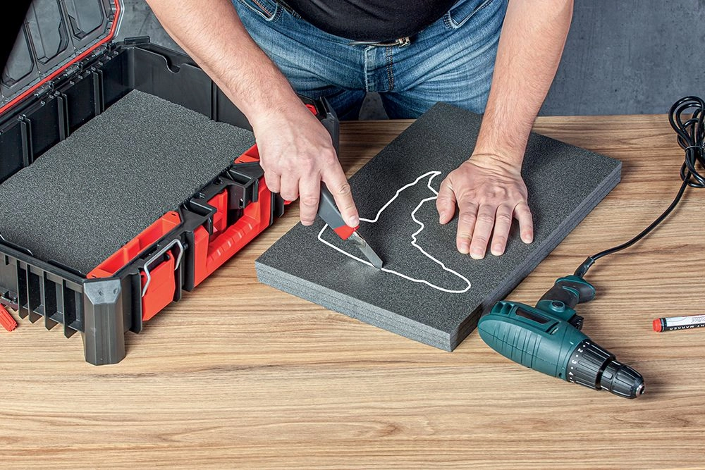 Tegn omridset af værktøjet og skær en præcis udhulning med et enkelt snit. Værktøjet bliver siddende sikkert uden uønsket bevægelse.