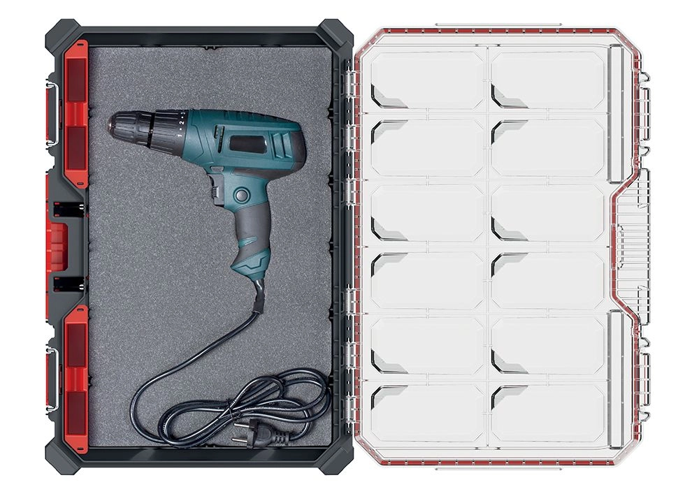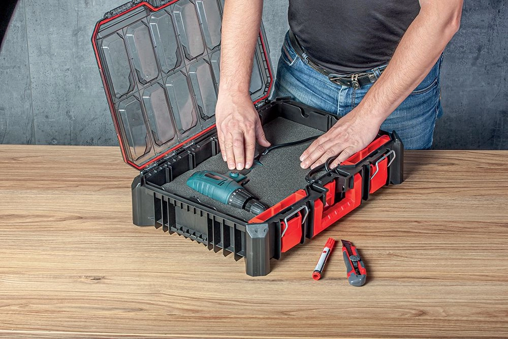 Denne grå skumindsats er designet til hurtig og præcis organisering af værktøj. Den tætte PE-struktur gør det nemt at forme med hobbykniv eller skarp kniv, så du kan lave perfekte udskæringer til boremaskiner, bits, måleværktøj og andet udstyr. I kufferten holdes værktøjet sikkert på plads og risikoen for skader reduceres.