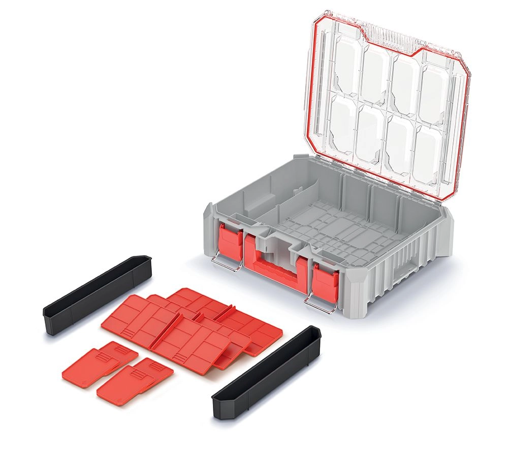 To aftagelige beholdere og syv flytbare skillevægge giver en fleksibel, modulær opbygning. Den tætte forsegling beskytter indholdet mod støv og fugt, hvilket gør organizeren ideel både til værkstedet og til montageopgaver i felten. Metal-/stærke låse og et robust håndtag sikrer sikker transport.