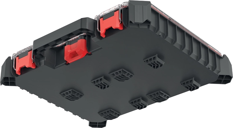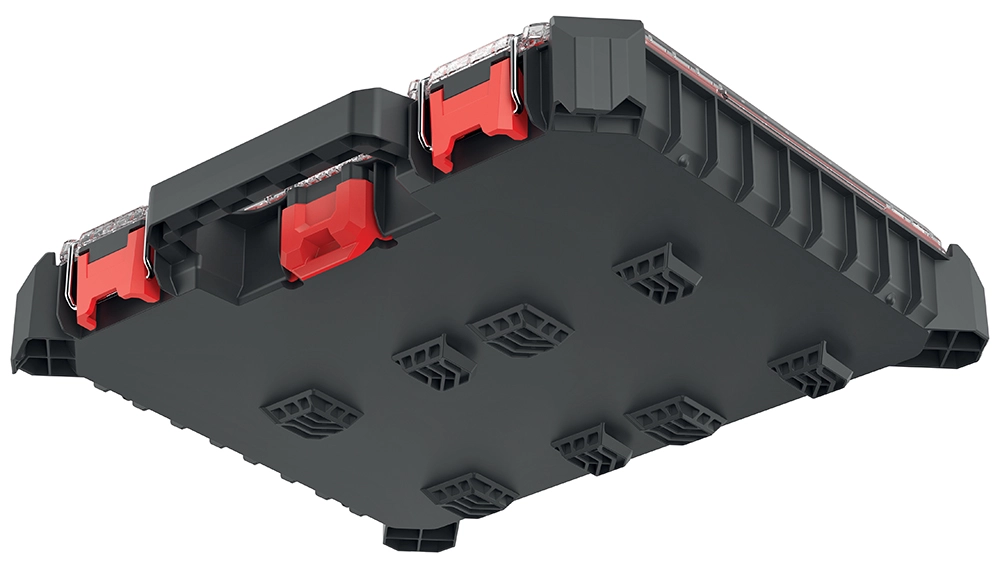 Det indvendige rum består af 10 aftagelige bokse, som let kan tilpasses aktuelle behov. Det gennemsigtige låg af polycarbonat giver overblik ved første øjekast, mens den tætte forsegling beskytter mod støv og vand. Metalhængsler og låse i ABS med metaldele giver høj robusthed.