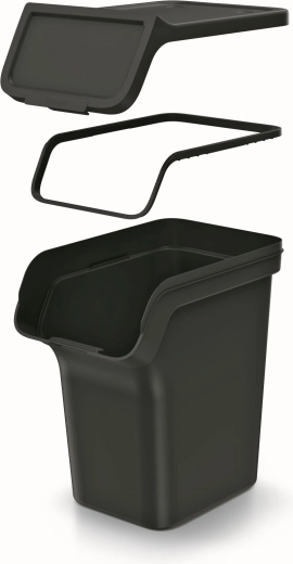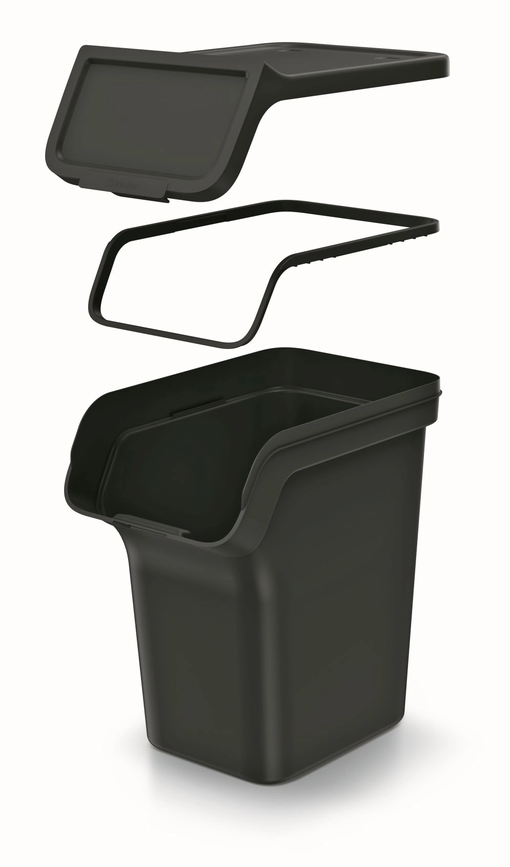 Spandene er lavet af genanvendt plast i sort og har en glat, let vaskbar overflade, som er modstandsdygtig over for alkohol, fedt og olier. Den aftagelige poseholder-ramme holder poserne sikkert på plads og gør udskiftning nem. Det moderne udseende og den modulære konstruktion passer til hjem, kontorer og offentlige rum.