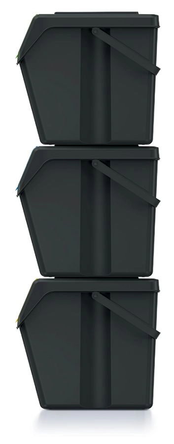 Det praktiske sæt med tre sorteringsspande SORTIBOX II fra Prosperplast giver pladsbesparelse, nem stabling og bekvem håndtering takket være håndtag og vippelåg med farvede klapper. Hver spand på 25 l er lavet af slagfast plast i genanvendt sort, og i pakken medfølger klistermærker til mærkning af affaldstyper, så sorteringen er overskuelig og intuitiv.