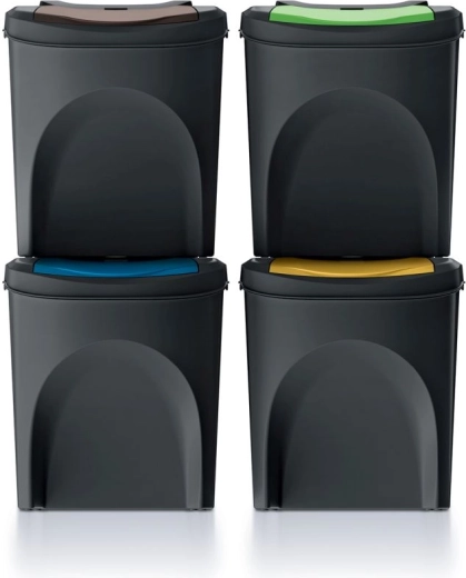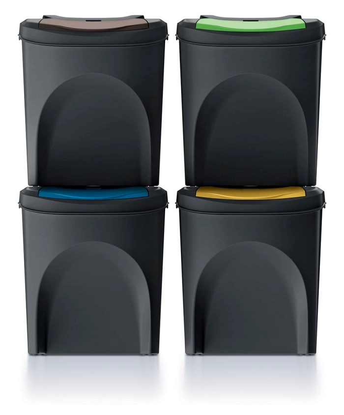 Sættet SORTIBOX giver en smart løsning til effektiv affaldssortering. Særligt formede låg med fordybninger muliggør sikker stabling, så du sparer plads selv i mindre rum. Den moderne genanvendte sorte farve passer ind i enhver indretning uden at tiltrække unødig opmærksomhed.