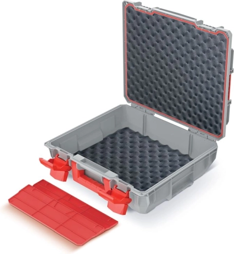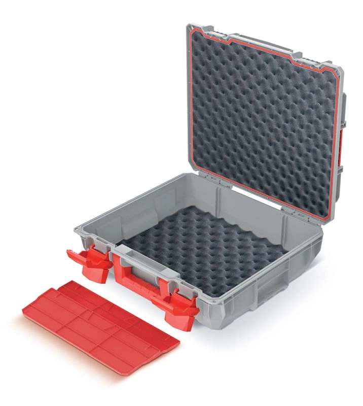 Takket være IP55-klassificeringen modstår den støv og vandstænk, mens ABS-låse holder låget sikkert lukket. To aftagelige skillevægge gør det muligt at konfigurere det indre rum efter behov, og det integrerede håndtag letter håndteringen selv ved fuld belastning op til 25 kg. De kompakte mål 45 × 38 × 13,5 cm passer nemt i værkstedet, bilen eller servicebilen.