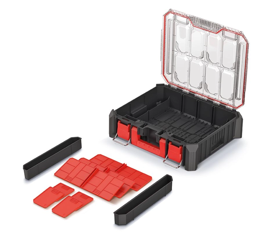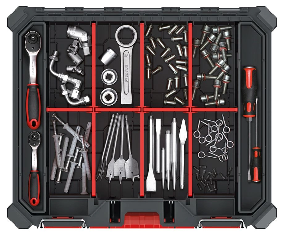 Den smarte indvendige opdeling med 2 separate beholdere og 7 udtagelige rum gør det nemt at organisere skruer, rawlplugs, bor og småt tilbehør. Den kvalitetsmæssige tætning forhindrer indtrængning af støv og vand og beskytter de opbevarede genstande. Metalhængsler og stærke ABS‑låse holder låget sikkert lukket, og det ergonomiske håndtag sørger for behagelig transport.