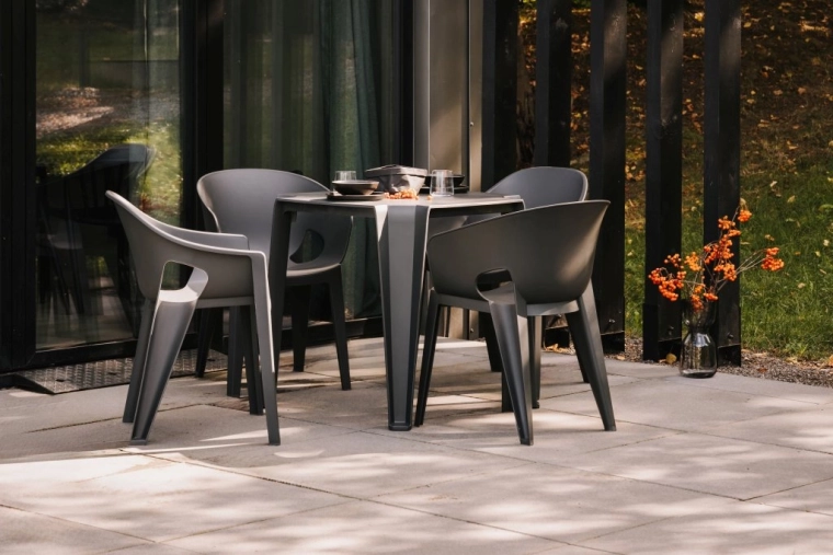 Spisebordet Lottie er fremstillet af kvalitetsplast, som er let, men samtidig robust og stabilt. Det modstår vejrpåvirkninger, UV-stråling og fugt, hvilket gør det til et glimrende valg til udendørs brug hele året. Den elegante lysegrå tone og de minimalistiske linjer kan nemt kombineres med forskellige møbelstile.