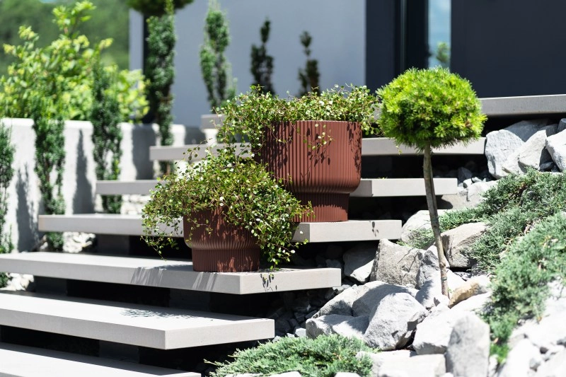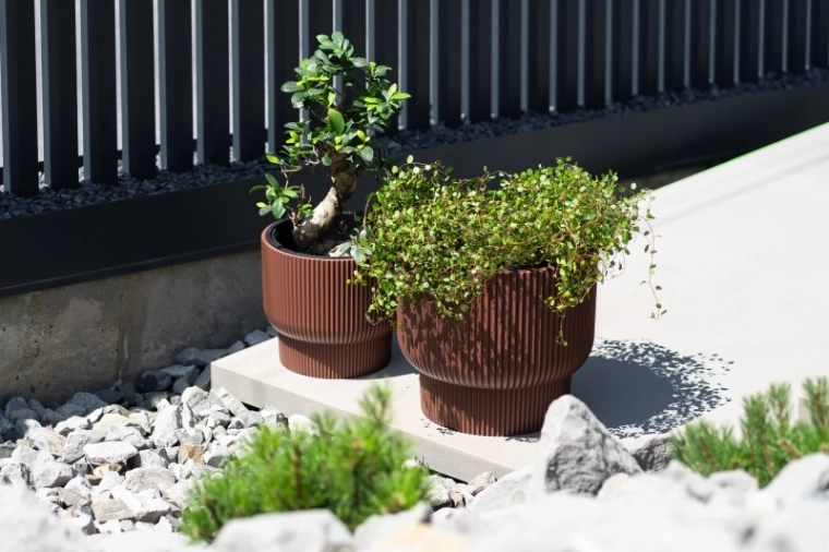 Den lodrette rillerstruktur og den elegante, tilspidsede silhuet indrammer planterne stilfuldt og understreger det moderne udtryk i dit rum.