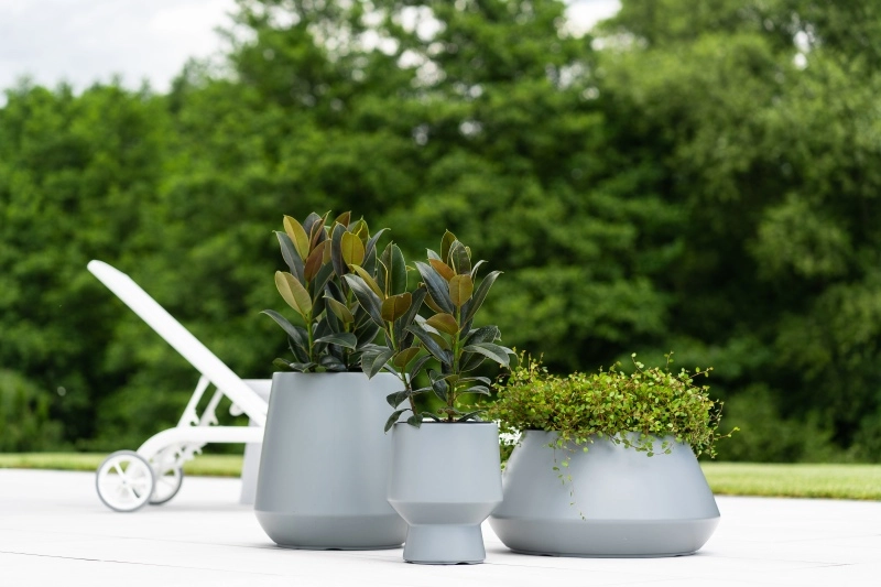 Den moderne form og den matte lysegrå farve passer smukt til udendørs siddeområder og grønne omgivelser. Ideel til patio, altan eller forhave.