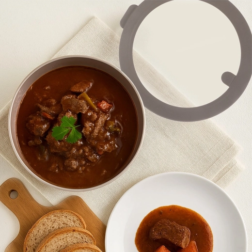 Denne robuste skål i en moderne beige nuance gør hverdagsmadlavningen og tilberedning af større portioner lettere. Takket være det gennemsigtige vindue i låget har du overblik over indholdet uden at åbne, mens dampventilen muliggør sikker opvarmning i mikrobølgeovn. Tætningsringen hjælper med at bevare friskheden og minimere lugtudslip.