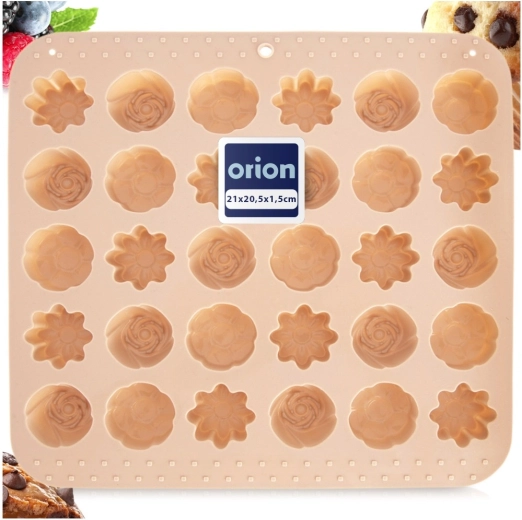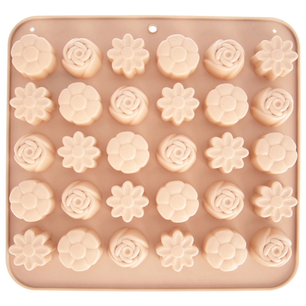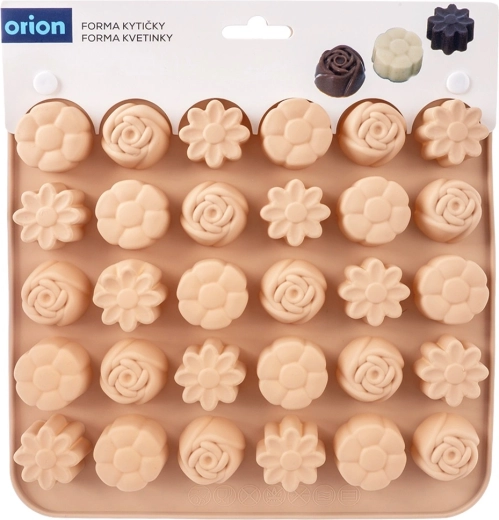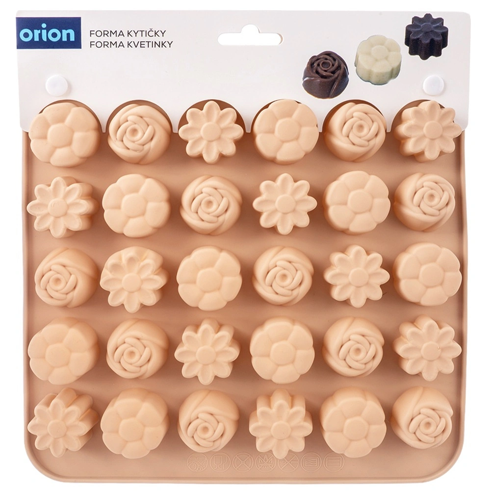 Denne alsidige silikoneform i beige gør det nemt at fremstille hjemmelavede praliner, chokolader og små småkager. Den tilbyder 3 forskellige blomsterdesigns og i alt 30 fordybninger, så du nemt kan lave imponerende serveringer og spiselige gaver. Takket være det fleksible og non-stick materiale slipper de færdige stykker let uden behov for at smøre.